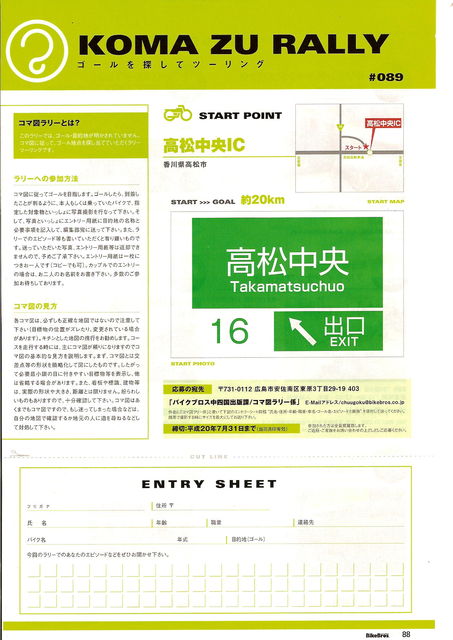 今回も一応イベントにしました 前回 http://mixi.jp/view_event.pl?id=31917161&comm_id=2256583 に続いて第2弾です。 今回の舞台は香川県です。 前回同様バイク雑誌「バイクブロス」に目的地でバイクと一緒に写した写真を投稿すると必ず掲載されます。 日時 :7月21日(月曜 祝日 の日) 行き先:ミステリーツアー(塩江温泉のチョット先のキャンプ場だと思う) (バイク雑誌BikeBrosの今月号コマ図ラリーの頁参照) 集合場所:?イズミヤ津高店(岡山市横井上)駐車場内のマクド前のあた