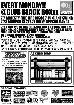 2008/7/21(MON)*祝日* 【RAGGA MONDAY SPECIAL】 @BLACK BOXxx 17:00START!! 『SOUND』 GOODIES GIANT SWING MODERN BEAT EVER RISING ALLIGETOR 『EARLY SELECTION』 TAKAMAN 『SOUND SYSTEM』 ONE PUNCH ADM:MEN \1500/1D LADIES \1000/1D 2008年6月より京都はBLACK BOXxxにて始動した月曜レギュラーダンス【RAGGA MONDAY】!!! 来る7/21(mon)は祝日ってことで、SPECIALやっちゃいます!!! SOUND SYSTEM『ONE PUNCH』導入!!! 良い音で、良い曲を聴いて、ラガなダンスを存分に楽しんで
