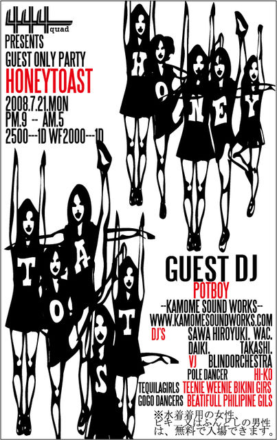 -HONEY TOAST- 2008/7/21(mon) start 21:00 close 5:00 doorchage 2500/1D ■Guest DJ POTBOY(kamomesoundworks/lasermagnetic) ■Dj's DJ DAIKI 澤 ヒロユキ MoRiMoRi(ontheline two) DJ TAKASHI Wac Mc(united passenger/Tommy's Boot Camp Recordz) ■VJ Blind Orchestra ■POLEDANCER HI-KO ■GO!GO!DANCER Beatiful Philipine Girls ■TEQUILA GIRLS TEENIE WEENIE BIKINI GIRLS この日は、海の日!夏の始まりをお知らせするパーティー 「Honey Toast」がいよいよ来週の月曜日に! ※ このパーティ