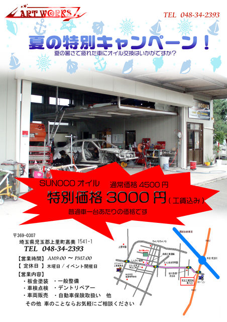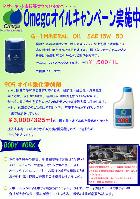 このたび、本庄サーキットで開催される サマーフェスティバルに ART WORK’Sがブースを出展することになりました。 また、普通の走行会なんかもあるので 見ていても退屈はしないと思います。 当日、お暇な方は、遊びに来てください。 それから、ART WORK’Sで サマーキャンペーンを実施し オメガオイルがお手軽価格で 提供されます。 これを気にいかが?