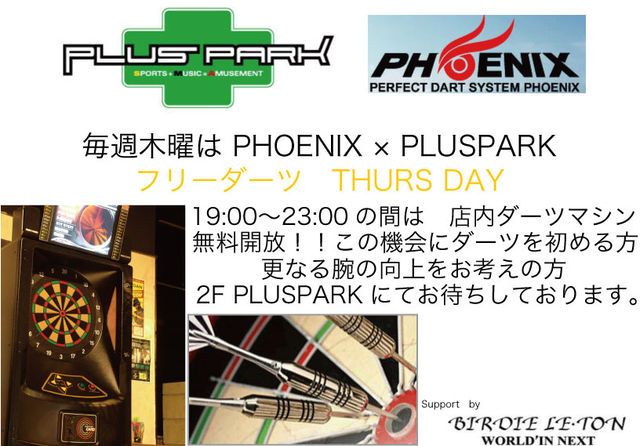管理人様告知失礼します。 毎週木曜はPLUSPARK×PHOENIX フリー ダーツ THURS DAYと称しまして 19:00〜23:00の間 店内設置のダーツマシンを 完全解放!! この機会にダーツを初めて見たい方。 当店スタッフによるルール説明等もありです!! 更なる腕の向上をしたい方はPHOENIXオンラインゲームのPLAYも可能です。 チャージもなんと無料、23:00以前に入場された方は23:00以降の SOUND BAR TIMEのチャージも無料とかなりお得なシステムになって おります。 ぜひ、この機会にPLUSPARKへ遊びにきてはいかがでしょうか??