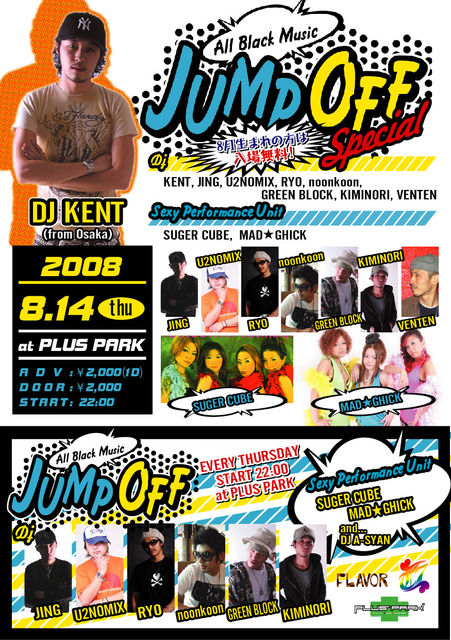 今、HIPHOP最重要都市として騒がれているここ名古屋で、勢力的に活動しているDJ達がPLUS PARKに集結! FLOOR DANCERも登場し、最高な木曜の夜を、演出しています! 週末さながらのPARTY STYLEと、決してHIPHOPだけにとらわれない間違いない選曲で、みなさんを魅了することでしょう! フライヤー持参の方は、1ドリンクつくので、是非、GETしてお持ち下さいね! そして 8/14(木)は、 お盆とゆうことで、JUMP OFF SPEICAL開催です! 大阪よりDJ KENTをGUESTに迎え、盛大にいきます! まだ "JUMP OFF"体感してない方は、ぜひこの機会に遊びに来て