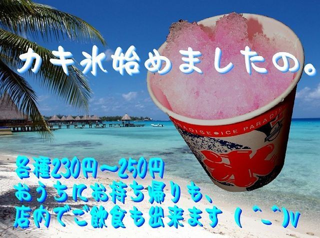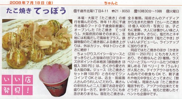 前号の「ちゃんと」に取材が掲載されました〜 練りに練った新作と 20種類のかき氷を始めました〜 たこ焼きてっぽうでは7/25〜8/15まで mixiをご覧になってご来店いただきました方に かき氷全品大盛にします。 会計時にお伝えくださいませ お持ち帰りもお召し上がりも出来ます。 家族で、友人と、お子様連れで、お一人でも お気軽にご来店くださいませ 営業時間 AM10:30〜PM7:xx (なくなり次第終了) 定休日 火曜日 たこ焼きてっぽうコミュに 詳しいメニューと地図が載っています。 どうぞ宜しく〜 ↓ http:/