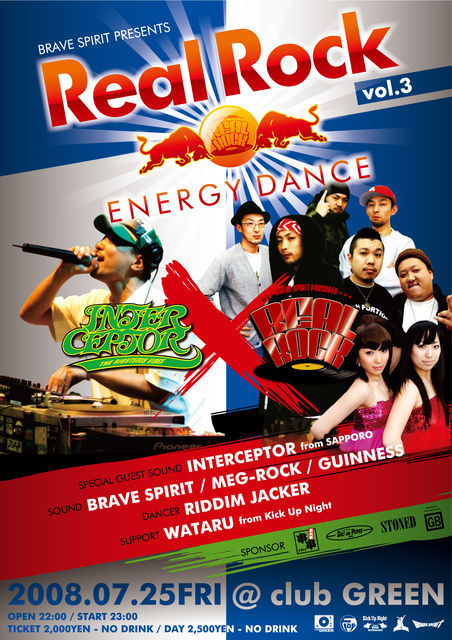BRAVE SPIRIT PRESENTS ◇REAL ROCK Vol.3◇ 2008.7.25(FRI) OPEN 22:00 START 23:00 ADM \2000 DAY \2500 ※協賛店でのご購入の場合1Drinkサービス! @clubGREEN <GUEST> INTERCEPTOR <DANCER> RIDDIM JACKER <SOUND> MEG-ROCK GUINNESS BRAVE SPIRIT