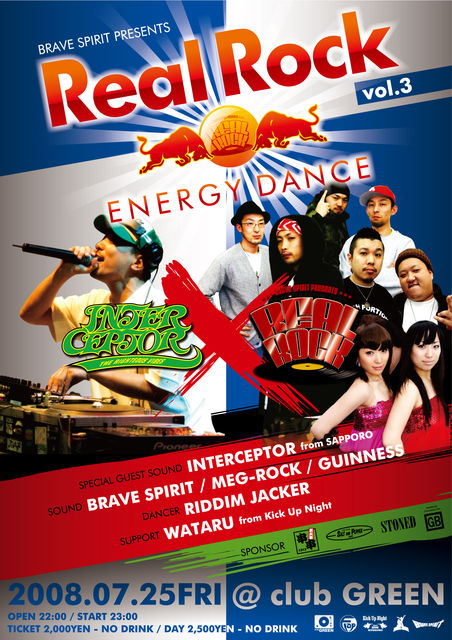 BRAVE SPIRIT PRESENTS ■ REAL ROCK ■ vol.3 - 2008.7.25.FRI - AT / club GREEN OPEN / 22:00 START / 23:00 TICKET 前売 2000yen 当日 2500yen ※協賛店でのご購入の場合1Drinkサービス! [ GUEST ] INTERCEPTOR [ SOUND ] BRAVE SPIRIT MEG-ROCK GUINNESS [ DANCER ] RIDDIM JACKER [ SUPPORT ] WATARU from KICK UP NIGHT [ 協賛店 ] 串串・Salt&Pepper・STONED・Grooooooove Box 益々盛り上がりをみせてきたRR! 第3回目!! 7月25日(金) 札幌のBIG S