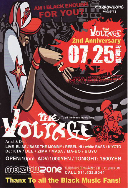 7/25(Fri) 【THE VOLTAGE 〜2nd Anniversary】 LIVE:ELIAS/BASS THE MOMMY/REBEL-HI/white BASS/KIYOTO DJ:KTA/DEE/ZIMA/MA$A/MA-BO/BIJYU OPEN:22:00〜 ADV:1,000YEN/TONIGHT1,500YEN morrow zone 中央区南7条西2丁目 EXE plaza B1F TEL011-523-8044 今回は2周年っちゅう事で盛り上げます 是非暇人も多忙な人も時間作って遊びに来てください〜