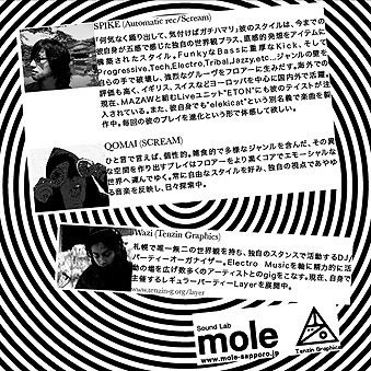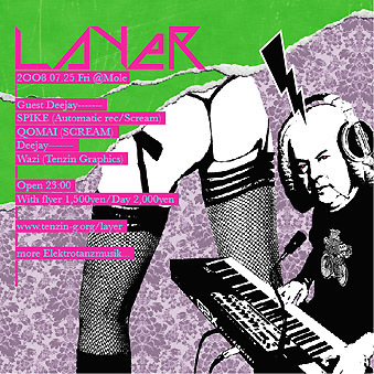 管理人様 告知失礼します Layer 2008.07.25(Fri) @Mole Guest Deejay------- SPIKE (Automatic rec/Scream) QOMAI (SCREAM) Deejay------- Wazi (Tenzin Graphics) Open 23:00 With flyer 1,500yen/Day 2,000yen more info http://www.tenzin-g.org/layer