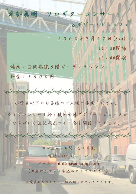 一年に一度イベントです 7月27日 ”岸部眞明 ソロギターコンサート&デザートビュッフェ” 12:30開場 13:00開演 正岡病院5Fガーデンラウンジにて 大阪から、ギタリストの”岸部眞明”さんに来ていただき http://www.sutv.zaq.ne.jp/ckbsr709/live.html ソロギターライブを開催いたします。 終了後、握手会&CD販売、デザートビュッフェを開催いたします。 料金は破格の1500円 ただし小学生以下の子供さんの入場はお断りしております (席の関係で先着50名様となりますので早めのご予約をお願いいたします) お申込