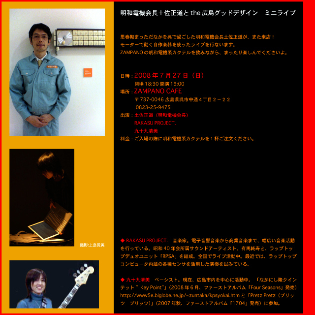 2005年広島にて、 土佐正道(当時・明和電機前社長)、九十九清美、そして私の3名で結成された 「明和電機前社長土佐正道とthe広島グッドデザイン」。 土佐正道さんはあれから明和電機会長にご就任され、 このたび、土佐さんの郷里、広島県呉市にて、 もう一度ライブすることになりました。 みなさま、是非是非お越し下さいませ! ----- 明和電機会長土佐正道とthe広島グッドデザインミニライブ 日時:2008年7月27日(日) 開場18:30 開演19:00 場所:ZAMPANOCAFE http://zampano.hp.infoseek.co.jp/ 〒