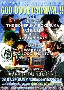 神戸新世界×Fu-ji Rock Festival'08 『GOD DOOR CARNIVAL!!vol.0』 7/27(Sun) @神戸スタークラブ OPEN/START 14:00/15:00 ADV/DOOR ¥2000/¥2500 Act おかん/THE BOKERUKA BOKERUKA/chaqq/逆Choice/D≠STAR HATE Guest !wagero!/fox loco phantom/SQUEEZE!! ☆関西に新しい風を!来年の海の家でのビッグフェス実現を目指した立ち上がった集団「神戸新世界」とそのイベント『GOD DOOR CARNIVAL!!vol.0』!! 告知用PV http://jp.youtube.com/watch?v=pRo-N1XsFCs 新世界HP http://14hp.jp/?id=goddoor 貴重なスペース、ありがとう