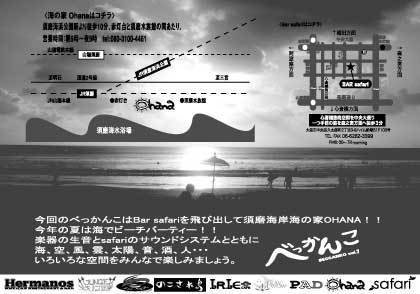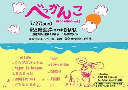 7/27(日) べっかんこ vol.7 in 須磨海岸 海の家『OHANA』 (JR「須磨海浜公園」駅より徒歩10分) open : 15:00 start : 15:30 〜 20:30 (雨天決行!) ¥1000(1drink付) 出演: ■くらげスカッシュ(サーフロックバンド) ■Nager la Brasse(ジャンベ&ダンスのアフリカングループ) ■pan打stickas(中低・中・高音スチールパンが中心のバンド) ■ミカミッヒ(今回は三上とベースのデュオ)←※※ ■ナツミカミ☆(女子ボーカルと三上のデュオ)←※※ DJ: ■low-ichiko ■ATOMU
