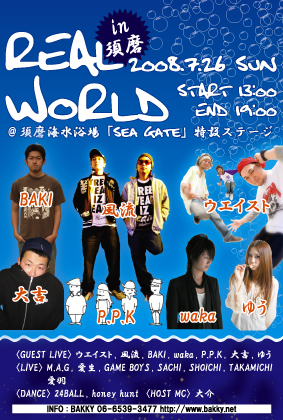 【REAL WORLD in 須磨】 [日程] 2008年7月26日(土曜日) [会場] 須磨海水浴場 海の家『Sea Gate』 JR神戸線『須磨海浜公園』駅 徒歩すぐ 須磨海浜水族園 裏 [時間] START 13:00 END 19:00 『出演者』 〈GUEST LIVE〉 :ウエイスト :風流 :BAKI :waka :P.P.K :大吉 :ゆう 〈LIVE〉 :M.A.G :愛生 :GAME BOYS :SACHI :SHOICHI :TAKAMICHI :愛羽 〈DANCE〉 :24BALL :honey hunt 夏到来!!暑い日が続く中、海の家での熱いイベント開催!! 海の家だから、入場とか無くて、無料