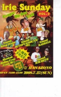 管理人様、告知失礼します。 IRIE SUNDAY vol.2 @HANAZONO (西明石) 2008.07.27(SUN) open.start13:00〜close21:00 入場 FREE SOUND M.R.C from神戸 MACBETH NATURAL STYLE RASKILL KING OCEAN OCTOPUS SOUND DEE JAY.SINGER 豪遊 丸慎 U-G AYAKA 今回は神戸より今勢いに乗っているM.R.Cを 迎えさらに楽しさUP もちろんラバダブあります 日曜日の昼間は入場FREEの Irie Sundayで決まりでしょ〓 西明石駅下車 国道2号線を東に徒歩5分右手にあります 貴重なスペースありがとうございまし