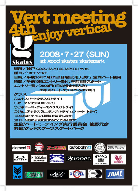 告知失礼いたします。 2008年7月27日(日)に第4回目を迎える『Vert meeting 4th』のお知らせです。 国内では数少ないVERTにスポットをあてた大会です。 ○ジュニアクラス ○ビギナー&レディースクラス ○オープンクラス ○エキスパートクラス とクラス分けをしておりますので、初心者から上級者まで幅広く参加して いただけるかと思います。 エキスパートクラス出場者には2008年のASIAN X-GAME入賞者も参加し 世界の滑りを見れる数少ないチャンスとなりますので、見学のみでも楽しんで いただけます! 参加者には豪華景品も