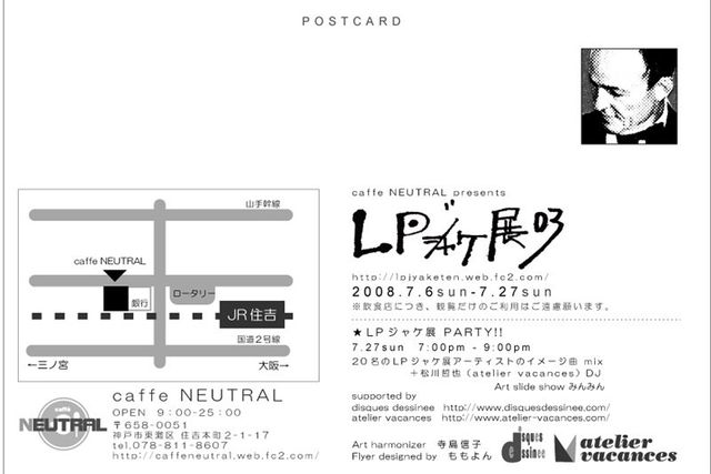 LPジャケ展03 恒例のLPジャケ展始まりました。 LPジャケ展とは アーティスト自らが選んだ曲から創造する オリジナルのジャケットアート展です。 今回のLPジャケ展では各アーティストが ジャケット・レコードレーベル・ライナーノーツをデザイン、なんだかうれしくなってしまって 「フェイクLP」まで作ってしまいました。 見るだけでなく触れる展示です。 旬のアーティスト20名の描くLPワールド。 レコードの重さとジャケットの大きさを楽しみながら 懐かしさと新しさを感じていただければうれしく思います。 caffe NEUTRAL