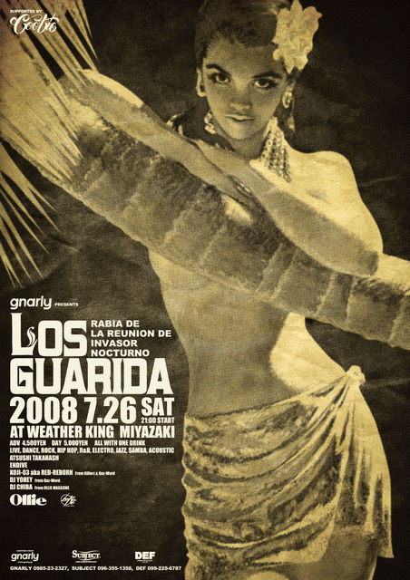 ジャムナイトの後はウェザーキングへGO!ジャムナイトのアフターパーティーという形で大阪、東京で豪華ゲストを迎えて開催されているクラブイベント“LOS GUARIDA”(ロスグアライダ)が宮崎に上陸☆ ジャムナイト出演者が来場します!だけじゃなく、なんと、ライブします!しかもジャムナイトとは違う形で!これはもはやジャムナイトよりヤバイ。 憧れのアーティストが同じフロアにいるという一夜限りの夢のような空間そして一夜限りのプレミアムライブを目の前で 【日時】2008/7/26(土) 【時間】21:00スタート 【会場