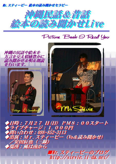 ■沖縄民話の読み聞かせLIVE in 糸満 ■日時:7月27日(日) Start 20:00 ■会場:風は南から(糸満市潮平 地図) ■出演:Mr.スティービー(読み聞かせ&Vo) /安田辰也(三線&太鼓&踊り) ■チャージ: 1,000円 ■お問い合わせ:098-852-3113