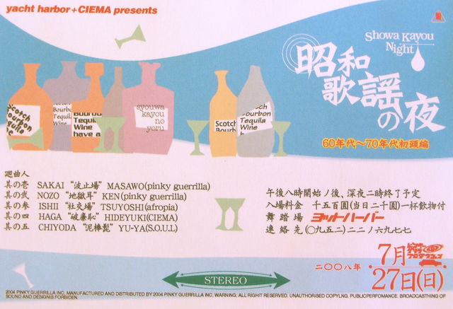 『昭和歌謡の夜』今年で何年目になるのでしょうか?記憶が定かではないのですが いまだに『こんなのあったんかい!』『これは無茶苦茶ファンクやん』とか言いながら の猟盤の日々ファズギターをこよなく愛し、フルートがリードするボサノバ、ジャズに酔いしれながら日本の歌謡曲も捨てたもんじゃないなと、、、タバコを一服 今回からは、いろんなテーマに沿って選曲する企画第一弾!日本の60’s〜70’sの 貴重な音源をクラブ・ミュージックとして蘇らせようと考えてみました。 サイケでデラックスでスパシーバな怪しい夜を