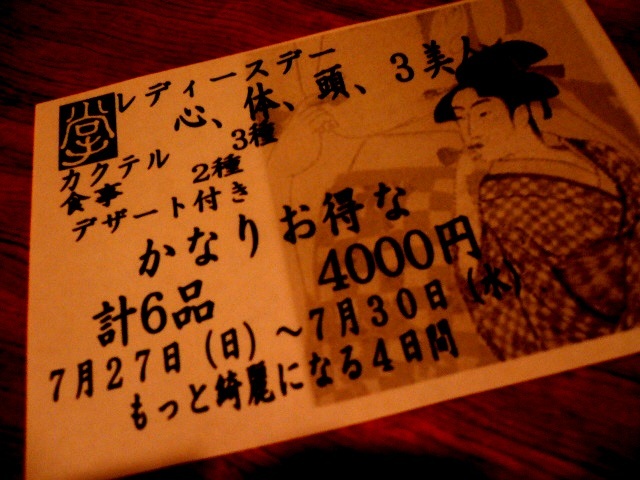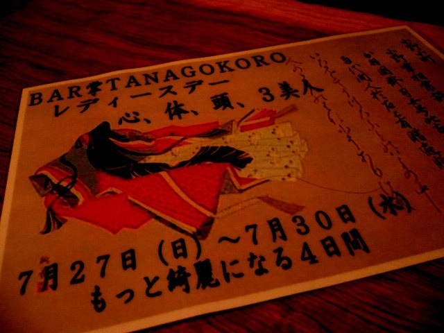 今月最後のイベントはコレダ すべての女性を≪更に・もっと≫・ 「綺麗に」「美しく」をテーマに BAR掌TANAGOKOROによる・・・・「ザ・レディースデイ」 「心・体・頭・・・・・・・3美人」 御食事3 カクテル3 のそれぞれ心・体・頭に合わせたメニュー構成でございます。 もちろんコースの御利用は「女性限定」 是非、本格的な「夏」を前にさらに「綺麗」になってみては Produce By K・YAMADA&Y・UEKI