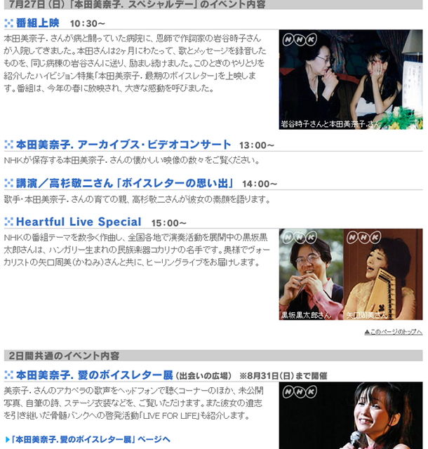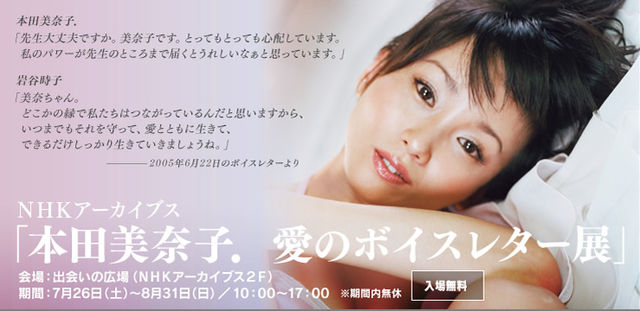 来月から、埼玉県川口市にあるNHKアーカイブスにて「本田美奈子.愛のボイスレター展」が行なわれます。 NHKさんに問い合わせた処、以下の様な事を予定しているそうです・・。 埼玉県川口市にあるNHKアーカイブスにて、本田美奈子.さんが、作詞家・岩谷時子さんを励ますボイスレターのことばと、美奈子.さんがつくった歌詞をパネルにして展示すると同時に、岩谷さんだけのために歌ったアカペラの歌声10曲あまりを、ヘッドホンで聴いていただく展覧会の企画。 また、デビューから亡くなるまでの軌跡をたどった番組の上映会。 更に、本田さん