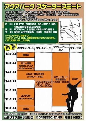日づけだけは決まっていた、7月のイベントですが、ついに内容が決定致しました!! 『みんなで流しそうめん』です。 せっかくなので、夏らしく♪ 場所はさいたま市秋ケ瀬公園にて。 (雨天の場合、橋の下なので出来る場所を検討中なので、雨天決行!!) 時間などの詳細は、コレから決めます。 ヒロ氏の協力のもと、流しそうめん装置を制作します!! つきましては、竹(太ければ太いほど?!)を調達できるツテのある方がいたら、教えてください!! その他、希望・提案・ありましたらよろしくデス☆