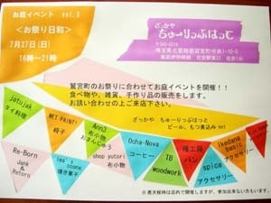7月27日(日) お庭イベントvol.3 <お祭り日和>を開催します。 16時〜21時頃 タイ料理や、パン、焼き菓子、おまんじゅう、コーヒー、ビール、もつ煮込み、手作り品、雑貨等の販売を行います。 お誘い合わせの上お気軽にご来店ください。 ※悪天候時は、店内にて開催しますが参加出来ない方もいらっしゃいます。 お問い合わせは、0480−58ー0143 tuliphat_dot@yahoo.co.jpまでお気軽にどうぞ。 |