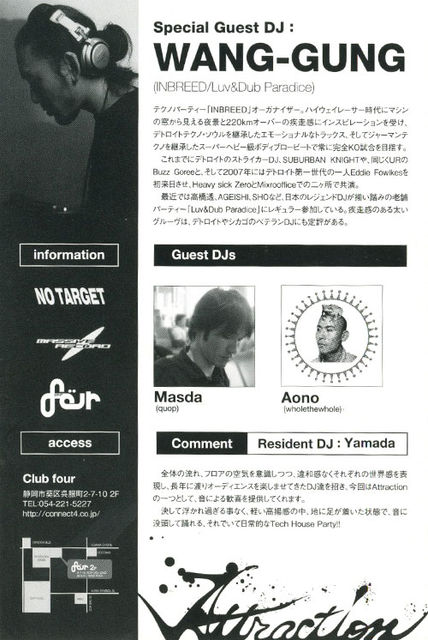 管理人様、告知失礼いたします。 不適切でしたら削除願います。 Attraction 2008.7.27(SUN) at four(静岡市) OPEN&START 21:00 CHARGE \1500yen(With 1D) ◆Special Guest WANG-GUNG(INBREED/Luv&Dub Paradise) ◆Guest DJ Masda(quop) Aono(wholethewhole) ◆Resident Dj Yamada ========================================== 全体の流れ、フロアの空気を意識しつつ、違和感なくそれぞれの世界観を表現し、長年に渡りオーディエンスを楽しませてきたDJ達を招き、今回はAttractionの一つとして、音による歓喜を提供して