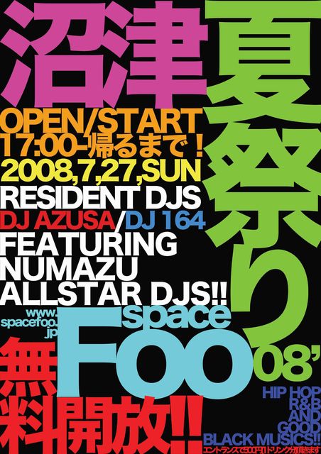 沼津の新名所… 今、ちょっと話題になっている新しい音楽系本格的CLUB 『spaceFOO』が、7月27日(日)の夏祭りの夕方より 無料開放します。 無料開放といっても、DJ陣に手抜きはありません。 DJ AZUSA & DJ 164以外にも、沼津を代表する豪華DJ陣が集結します。 この機会にspaceFOOでイイ音を体感してください。 『沼津 夏祭り 08'』 "space FOO 無料開放!!" 2008'07/27(日) @space FOO ■HIP-HOP,R&B, and Good Black Music… ■OPEN 17:00〜LAST ■入場無料 (※但し入場時1ドリンク分500円頂きます) ★Regiden