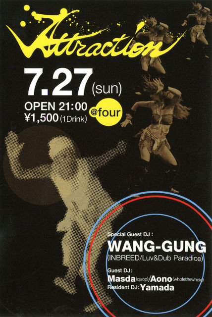 管理人様、告知失礼いたします。 不適切でしたら削除願います。 Attraction 2008.7.27(SUN) at four(静岡市) OPEN&START 21:00 CHARGE \1500yen(With 1D) ◆Special Guest WANG-GUNG(INBREED/Luv&Dub Paradise) ◆Guest DJ Masda(quop) Aono(wholethewhole) ◆Resident Dj Yamada ========================================== 全体の流れ、フロアの空気を意識しつつ、違和感なくそれぞれの世界観を表現し、長年に渡りオーディエンスを楽しませてきたDJ達を招き、今回はAttractionの一つとして、音による歓喜を提供してくれます