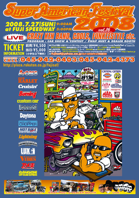 スーパーアメリカンフェスティバル2008 VOL.16 富士スピードウェイ 夏はアメフェス!富士スピードウェイ、7月27日!! カーショー&コンテスト 今年もすごいアメ車やハーレー、ワーゲン、SUV、ハイドロが大集合 します。アメ車だけでも3000台、ハーレーも1000台以上。全部 集まるのはアメフェスだけ!アメリカンテイストいっぱいの車を、 ここで目一杯堪能できます。 展示車両の中から、アメフェス賞と上記ポスターの左にある雑誌社賞の受賞車が選ばれます。 ディーラーブース&スワップミート アメ