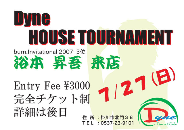 開 催 日 :2008年7月27日(日) 時 間 :12:00開場―13:00 Game On 内 容 :ダブルス(Hi&Low) 501(OI/OO) / Cri / 501(OI/OO) ENTRY FEE :¥3000(1ドリンク付) ※完全前売チケット制です。チケット完売次第終了です。 チケットはDyneでの販売となります。 予約も受け付けますが、早くに取りに来て下さい。 買いに来た方が優先して販売していきますので宜しくお願いします。 特別企画! ガチンコシングルSHOGOに挑戦! ※エントリーは当日にRt上位から希