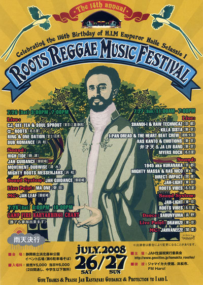 今年もありますROOTS REGGAE MUSIC FESTIVAL! I-PAN DREAD & THE HEARTBEAT CREWで27日に出演決定! 他の出演者、時間などは下記参照。 もしくはホームページまで。 http://www.geocities.jp/hamakita_rootsfes/topmenu-page.html 2008/7/26(土) 3:00PM - 7:00PM Live! CJ, GEE TEA & SOUL SPROUT(焼津 三重 静岡) α- ROOTS(名古屋) RING &ONE DATION(富士 沼津) DUB ROMANCE (浜松) Sound HIGH TIDE(焼津) JAH GUIDANCE(御前崎) MOVEMENT DUBWISE(清水) MIGHTY ROOTS MESSENJAHS(浜松) Sound System JAH GUIDANCE(御前