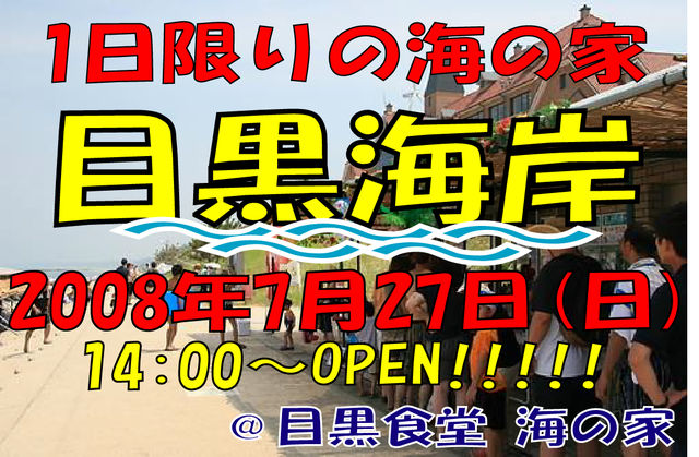 夏・夏・夏の季節がやってきましたー 2008年7月27日(日) OPEN 14:00〜 初DAYイベント 今回の目黒祭は番外編目黒に海が出現 1日限りの海の家をオープン その名も 【目黒海岸】 営業開始 目黒海岸限定 ★冷えたビールに