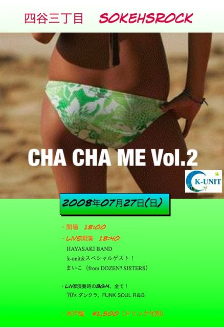 昨年11月に続き、 四谷三丁目 sokehsrock http://www.sokehsrock.com/ で、再びHAYASAKI BAND(takanaka、Fusion等)、 http://www.alles.or.jp/~hysk/index.html と、k-unit&スペシャルゲスト!まいこ (from DOZEN? SISTERS) http://mixi.jp/view_community.pl?id=81983 で、 CHA CHA ME Vol.2開催。 勿論、今回も2バンドの生演奏と70年代音源、 ディスコ イベントを合体させたイベントです! (座席&スタンディング)。 まあ、夏全開って事で!、今回はHAYASAKI BANDには 更に!takanakaナンバー増やしていただきた