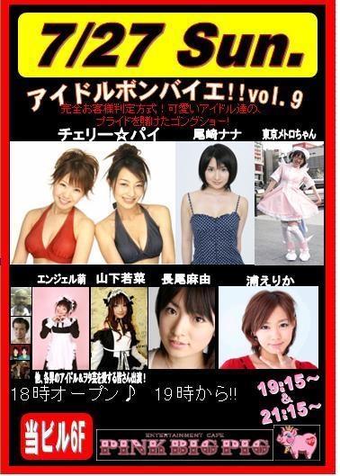 【アイドルボンバイエ!Vol.9】 ■2008年7月27日(日) ■新宿ピンクビッグピッグ 1部/19:15〜アイドルボンバイエ!LIVEやっちゃいます!! 2部/21:15〜アイドルボンバイエ!〜魅惑のアイドルゴングショー〜 【1部/19:00〜】 ■出演 【MC】 ゴー☆ジャス(まだ調整中w) 【MCアシスタント】 長尾麻由、尾崎ナナ チェリー☆パイ、疋田紗也 、エンジェル萌、東京メトロちゃん、山下若菜 【次はスベらない!?】 武藤刑事 & ミニ沢ミニ晴 【緊急参戦 特別ゲスト!】 パンクラスより川村亮選