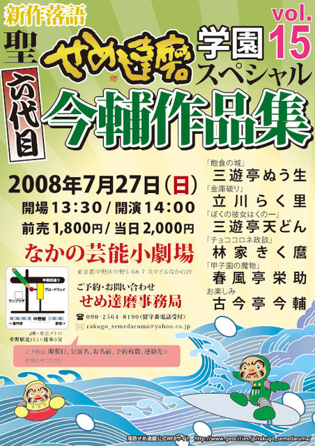 次回のせめ達磨は六代目今輔作品集です。 このコミュのかたにはおなじみのネタばかりですが、せめ達磨メンバー全員で挑戦します。今輔師自身も『ネタ下ろしします!』との意気込み。 ※いつもは夜公演ですが、今回は昼です!開演時刻にご注意ください。 2008年7月27日(日) 14:00開演 (13:30開場) 会場:なかの芸能小劇場 (JR線・地下鉄 中野駅北口歩5分) 出演: *お楽しみ* 古今亭今輔 『甲子園の魔物』 春風亭栄助 『チョココロネ政談』 林家きく麿 『ぼくの彼女はくの一』 三遊亭天どん 『金庫破り』 立川らく里