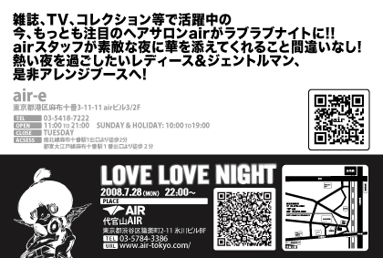 毎月最終月曜日に西麻布YELLOWにて行われていた老舗イベント「LOVE LOVE NIGHT(ラブラブナイト)」 2008年4月28日GW SPECIALでは900人近くの方に来て頂きました 感謝 そして涙のイエローでのfinalが5/26イエローでの開催で主要キャストが全員出演の感動のフィナーレ そして7/28に再び復活 是非遊びに来て下さい イベントコミュニティー http://mixi.jp/view_community.pl?id=186704 TITLE/LOVE LOVE NIGHT DATE/2008年7月28日月曜日 OPEN/22:00 PLACE/代官山AIR 住所/東京都渋谷区猿楽町2-11氷川ビルBF CALL/03-5784-33