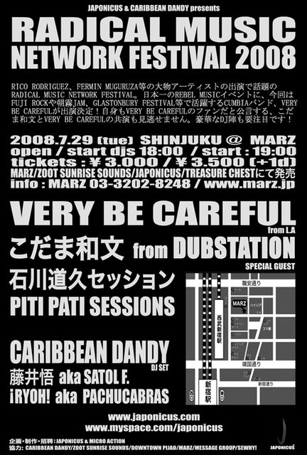 RICO RODRIGUEZ、BANDA BASSOTTI、FERMIN MUGURUZA等の大物アーティストの出演で話題のRADICAL MUSIC NETWORK FESTIVAL。日本一のREBEL MUSICイベントに、今回はFUJI ROCKや朝霧JAM、GLASTONBURY FESTIVAL等で活躍するCUMBIAバンド、VERY BE CAREFULが出演決定!自身もVERY BE CAREFULのファンだと公言する、こだま和文とVERY BE CAREFULの共演も見逃せません。豪華なDJ陣も要注目です!