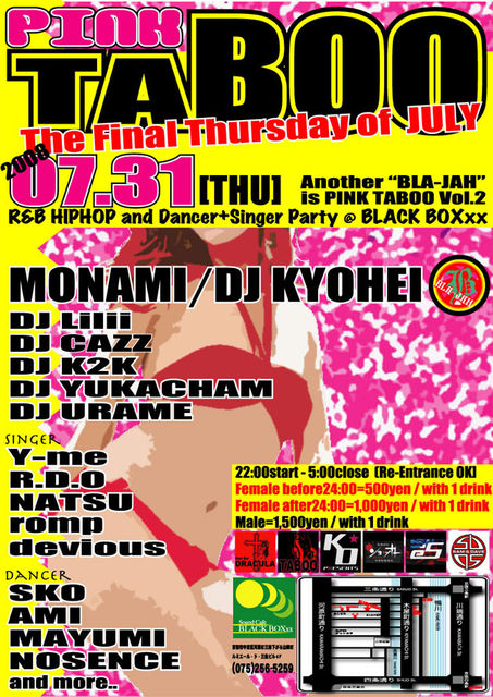 女性出演者多めの平日イベント「PINK TABOO」 【開催日】:2008/7/31(木) 【場所】京都木屋町BLACK BOXxx 075-256-5259 【MAP】http://www.chizumaru.com/maplink.asp?SER=all&D=all&X=488782.345&Y=126015.512&SCL=275 【料金】女性1,000円-1d 男性1,500円-1d 【割引】24時までにお越しの女性の方は500円-1dでご入場していただけます。 【出演者】DJ KYOHEI/DJ Lilii/DJ CAZZ/DJ K2K/DJ YUKACHAM/DJ URAME 【シンガー&MC】MONAMI/R.D.O/romp/NATSU/Devlous 【ダンサー】S.K.O/AMI(POLE DANCE)/MAYUMI/NOSENCE 【 イベントタイトル