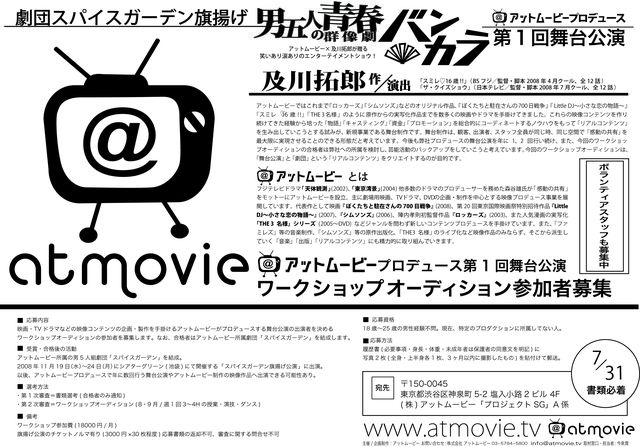 TVドラマ、映画、舞台に興味のある方、必見です!! ・・・・・・・・・・・・・・・・・・・・・・・・・・・・・・・・・・・・・・・ 11月19日〜24日のアットムービープロデュース第1回舞台公演 「バンカラ〜劇団スパイスガーデン旗揚げ公演〜」(シアターグリーン) ・・・・・・・・・・・・・・・・・・・・・・・・・・・・・・・・・・・・・・・  BSフジドラマ「スミレ16歳!!」や日本テレビドラマ 「ザ・クイズショウ」(片桐仁・戸次重幸出演)の脚本監督を手掛ける及川拓郎が、 11月に行う舞台の役者を募集しています