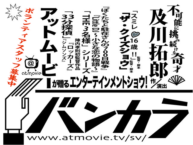 TVドラマ、映画、舞台に興味のある方、必見です!! ・・・・・・・・・・・・・・・・・・・・・・・・・・・・・・・・・・・・・・・ 11月19日〜24日のアットムービープロデュース第1回舞台公演 「バンカラ〜劇団スパイスガーデン旗揚げ公演〜」(@池袋シアターグリーン) 舞台役者、ボランティアスタッフ募集!! ・・・・・・・・・・・・・・・・・・・・・・・・・・・・・・・・・・・・・・・ BSフジドラマ「スミレ16歳!!」や日本テレビドラマ 「ザ・クイズショウ」(片桐仁・戸次重幸出演)の脚本監督を手掛ける及川拓郎