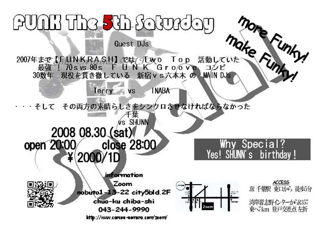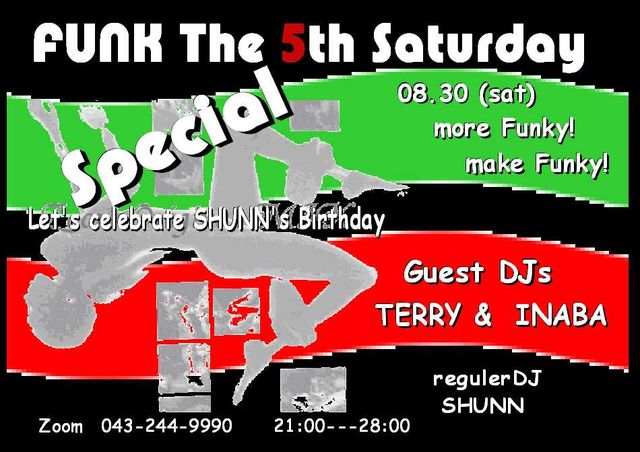☆☆☆SPECIAL☆☆☆ 〜★FUNK★the 5th Saturday〜 ::::more Funky !:::: ::::make Funky !:::: 《The 5th Saturday in Zoom》 年に4回の第5土曜日は もっと Funkyに! どっぷりFunkyに! 1970年代・・Discoが大ブレイクした その前から そして今も、『大衆の踊り場』の原点・黒人音楽! Funk&Soul sound 遠く母国を離れ、縛り付けられた日常からの開放を 週末に集まり つかの間の快楽を求めた兵隊達が 「音」と「踊り」で造り上げたあの空間を たまには そしてどっぷり味わってみませんか?