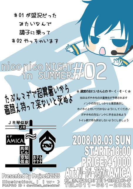 5月31日の#01にてご好評頂きありがとうございました!! 調子こいて#02を開催しますっ!! ニコニコNIGHTでは「ニコニコ動画をクラブ&ライブ形式で楽しもう!」という 趣旨のイベントです。 合唱、踊りはもちろんの事、参加者全員が一体となって楽しめるイベントを目指してます(´∀`) 以下、イベントの詳細になります。 参加希望される方は是非一度お読みになって下さい。 また随時情報も更新していきますので、お見逃しなく!! 携帯サイトオープンしました〜♪ http://www.project2525.net/mobile/ 前座イベント、ニコニコFre