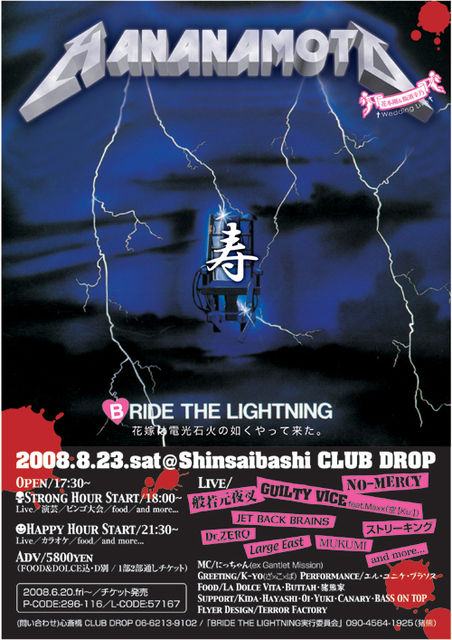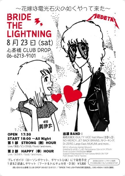 伝説の男、花本剛、、、 とうとう結婚! やっとこ結婚! ホンマに結婚! BRIDE THE LIGHTNING 〜花嫁は電光石火の如くやって来た〜 8/23(土)心斎橋 CLUB DROP open17:30 start18:00 1部 STRONG(剛)HOUR 2部 HAPPY(幸)HOUR 終了予定時刻は「翌朝」です。 あの伝説のバンド達も大復活ゲスト多数ヤバイです 現在8バンドがエントリー。あの漫才ユニットも登場します プレイガイドにてチケット絶賛発売中です