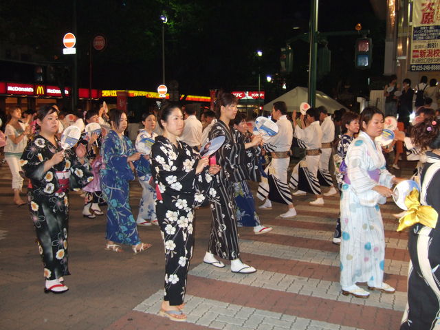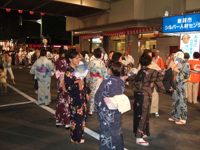 8月8日(金) 19:00〜21:00 万代シティ会場(ラブラとマクドナルドの間の通りです)で踊ります この会場は新潟甚句と佐渡おけさを両方踊ります。 踊り方がわからなくても大丈夫です。 お手本の方が脇で踊っていますし、毎年なんとなく出来るようになります 民謡流しは見ているだけより、参加したほうがずっと楽しいもの ゆかたは自由ですので、うちのチームはとても華やかですよ 尚、男性の参加、特に歓迎!! 行列の脇で大うちわを扇いでくれる方をお願いしたいです。 参加費無料。