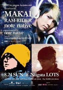 告知失礼します。 invitation6から3ヶ月。 再び新潟にMAKAI登場です。 今回は夕方よりの開催なので次の日仕事の方でも大丈夫です!! ぜひぜひよろしくおねがいします!! invitation vol.8 20080824(日)@新潟Lots GUEST DJs MAKAI RAMRIDER note native and secret Dj GUEST LIVE note native SUPPORT DJs:TAKUMA(studio Roop) / SHOWTA(soi) OPEN18:00 CLOSE 24:00 前売¥3,000/1drink TOTAL INFO. compass 025.224.4131 / molt 025.223.3031 / ECLIPSE 025.223.7606 / 新潟LOTS 025-246