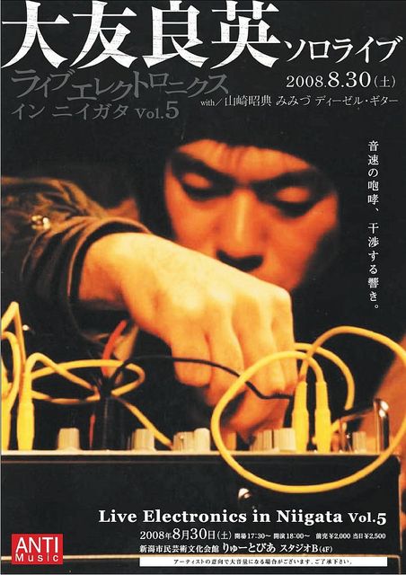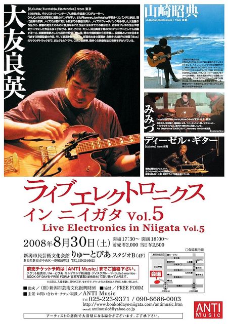 ◆Live Electronics in Niigata vol.5 ●出演 ・大友良英 (E.ギター、ターンテーブル、エレクトロニクス) ・山崎昭典 (A.ギター、エレクトロニクス) ・みみづ (Max/MSP、パーカッション、ミキサー) ・ディーゼル・ギター (E.ギター、エレクトロニクス) ◆会場 ・りゅーとぴあ スタジオB (新潟県新潟市中央区一番堀通町3-2) http://www.ryutopia.or.jp/ ・8/30(土) 17:30open 18:00start 22:00close ・前売 \2000 当日 \2500 ◆問合せ・前売予約 ・メッセージ http://mixi.jp/send_message.pl?id=494671 ・メー