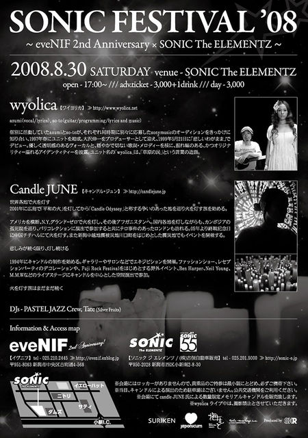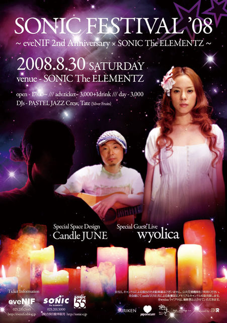 毎年夏に様々なアーティスト、DJを招いて開催されるSONIC FESTIVAL。 第3回目の今回はeveNIFのオープン2周年記念も兼ねてのコラボレーションフェスティバルになります☆ 今回はcandle JUNE氏に会場となるSONIC The ELEMENTZの屋内、屋外、全ての空間をデコレーションしていただきます! また、JUNEさんが造り出す外の特設ステージではwyolicaのSPECIAL LIVE! 心待ちにしていた方も多いと思いますが、新潟初LIVEでもあります! ★SONIC FESTIVAL 2008 ★ [eveNIF 2nd Anniversary×SONIC The ELEMENTZ] ■日時 8月30日(土)