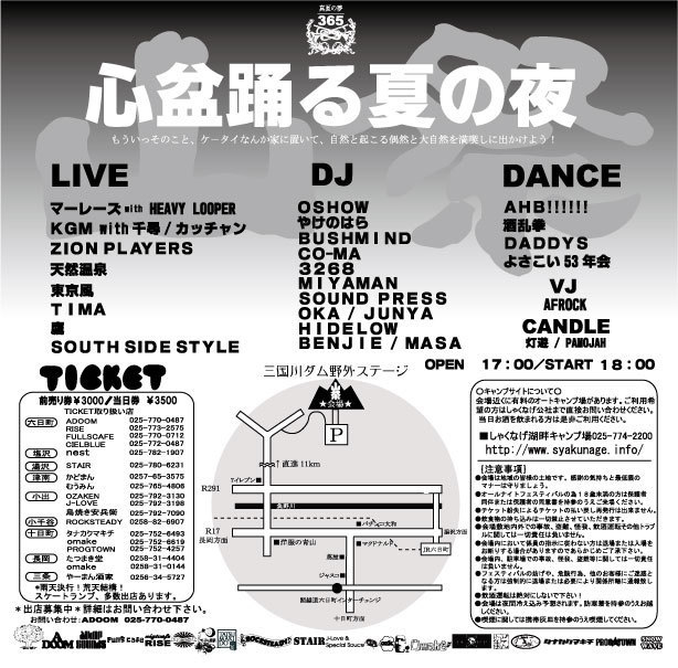 〜 心盆踊る夏の夜 〜 もういっそのこと、ケータイなんか家に置いて、 自然と起こる偶然と大自然を満喫しに出かけよう! ━━━━━━━━━━━━━━━━━━━━━━━━ △▲△▲ 第四回 山祭 2008年8月16日(土) ▲△▲△ ━━━━━━━━━━━━━━━━━━━━━━━━ ■日時 8月16日(土) 雨天決行!荒天結構! open 17:00/start 18:00〜 ■場所 三国川ダム野外ステージ 新潟県南魚沼市舞台745-48 ■チケット 前売り券¥3,000/当日券¥3,500