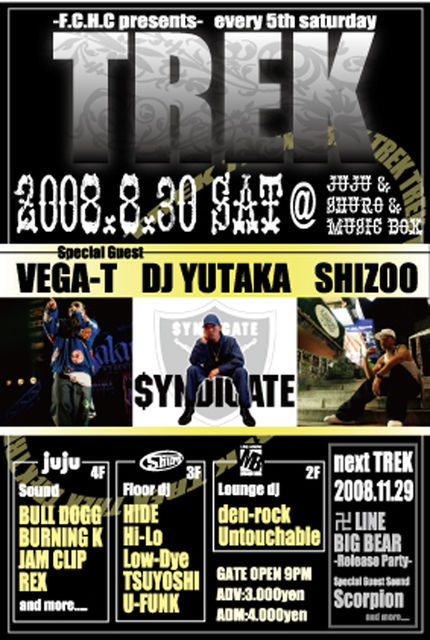 クラブ業界の第一線で活躍するアーティストを甲府に迎え 毎度アツイ夜をお送りしている『TREK』ですが!!! 今回のゲストは! 日本HIPHOPの第一人者DJ YUTAKA! 練マザファッカーからは匠で巧みなラップを操るSHIZOO! L.Aや日本各地でも活躍し甲府をレペゼンするVEGA-T! そして山梨からも地元を代表するアーティストが多数出演!! REGGAEフロアー☆HIPHOP/R&Bフロアー☆LOUNGEフロアーと 自分好みで好きに楽しめちゃいます。 3フロアーで繰り広げられる夢の競演! こりゃ間違いないっす! 特別な夜を、どーぞ体感して下さ